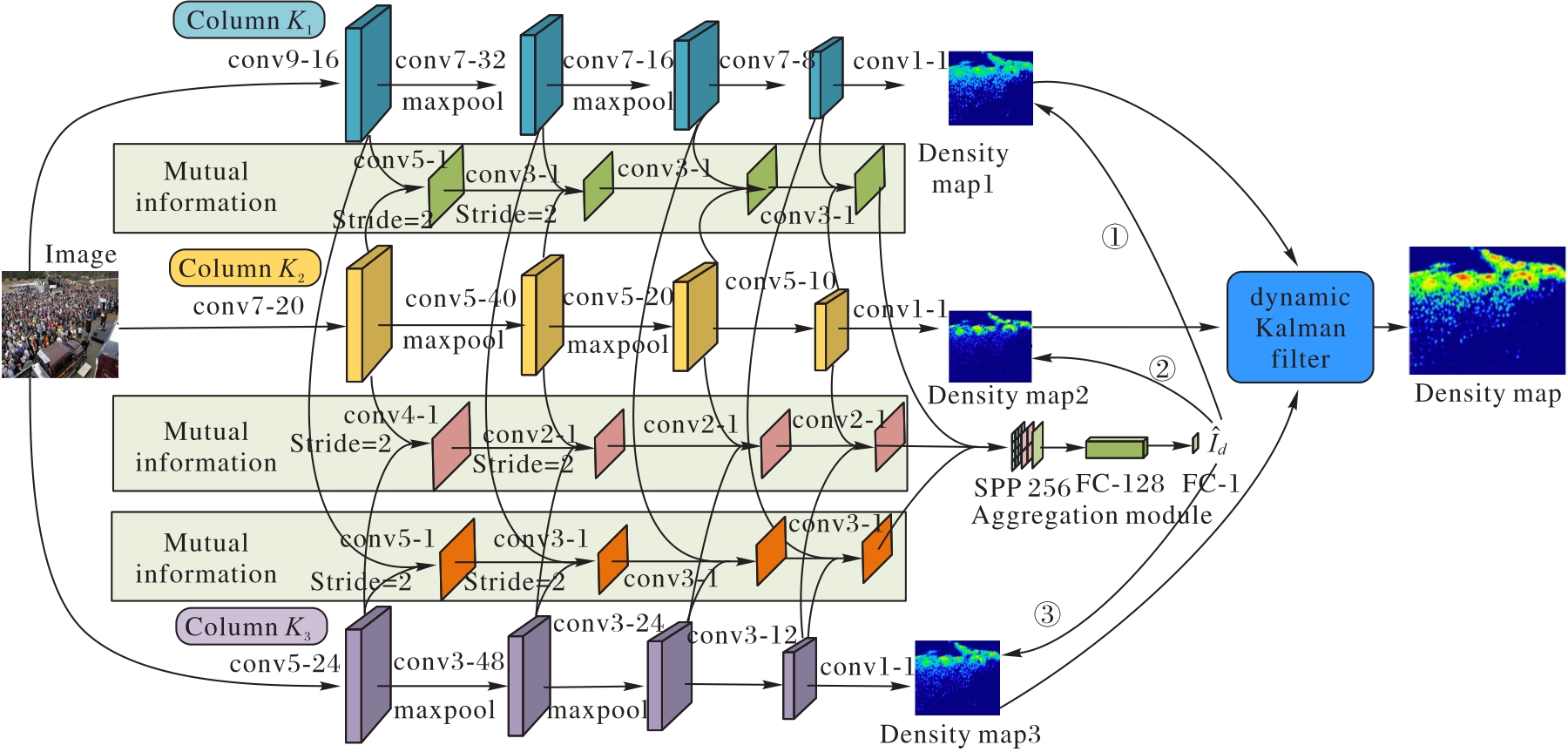 针对现有人群计数算法采用同步人工优化深度学习网络,忽略了网络学习的负面信息,导致大量冗余参数甚至过拟合,进而影响到计数准确性的问题,提出基于多列卷积神经网络MCNN(Multi-column Convolution Neural Network)的参数异步更新算法。首先将单帧图像输入网络,经过三列卷积分别提取不同尺度特征,通过列之间的交互信息学习两列间特征图的关联性;接着,根据优化的交互信息及更新的损失函数异步更新每列参数直至算法收敛;最后采用动态卡尔曼滤波将每列输出密度图进行深度融合,并对融合的密度图中所有像素求和得到图像总人数。实验结果表明,所提算法在UCSD(University of California San Diego)数据集上的平均绝对误差(MAE)比该数据集上最优MAE表现的ic-CNN+McML(Iterative Crowd Counting Convolution Neural Network Multi-column Mutual Learning)减小了1.1%,均方误差(MSE)比该数据集上最优MSE表现的CP-CNN(Contextual Pyramid Convolution Neural Network)减小了4.3%;所提算法在ShanghaiTech Part_A数据集上的MAE比该数据集上最优MAE表现的ic-CNN+McML减小了1.7%,MSE比该数据集上最优MSE表现的ACSCP(Adversarial Cross-Scale Consistency Pursuit)减小了3.2%;在ShanghaiTech Part_B数据集上的MAE和MSE分别比该数据集上最优MAE和MSE表现的ic-CNN+McML减小了18.3%、35.2%;在UCF_CC_50(University of Central Florida Crowd Counting)数据集上的MAE和MSE分别比该数据集上最优MAE和MSE表现的ic-CNN+McML减小了1.9%、9.8%。可见,该算法能有效提高人群计数的准确性和鲁棒性,且允许输入图像具有任意大小或分辨率,能适应检测目标的大尺度变换。