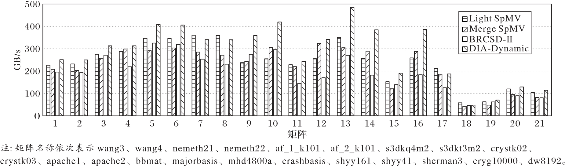 Fig. 10 Performance comparison of DIA-dynamic, DIA, Light SpMV, Merge SpMV, Tile SpMV, and BRCSD-Ⅱ