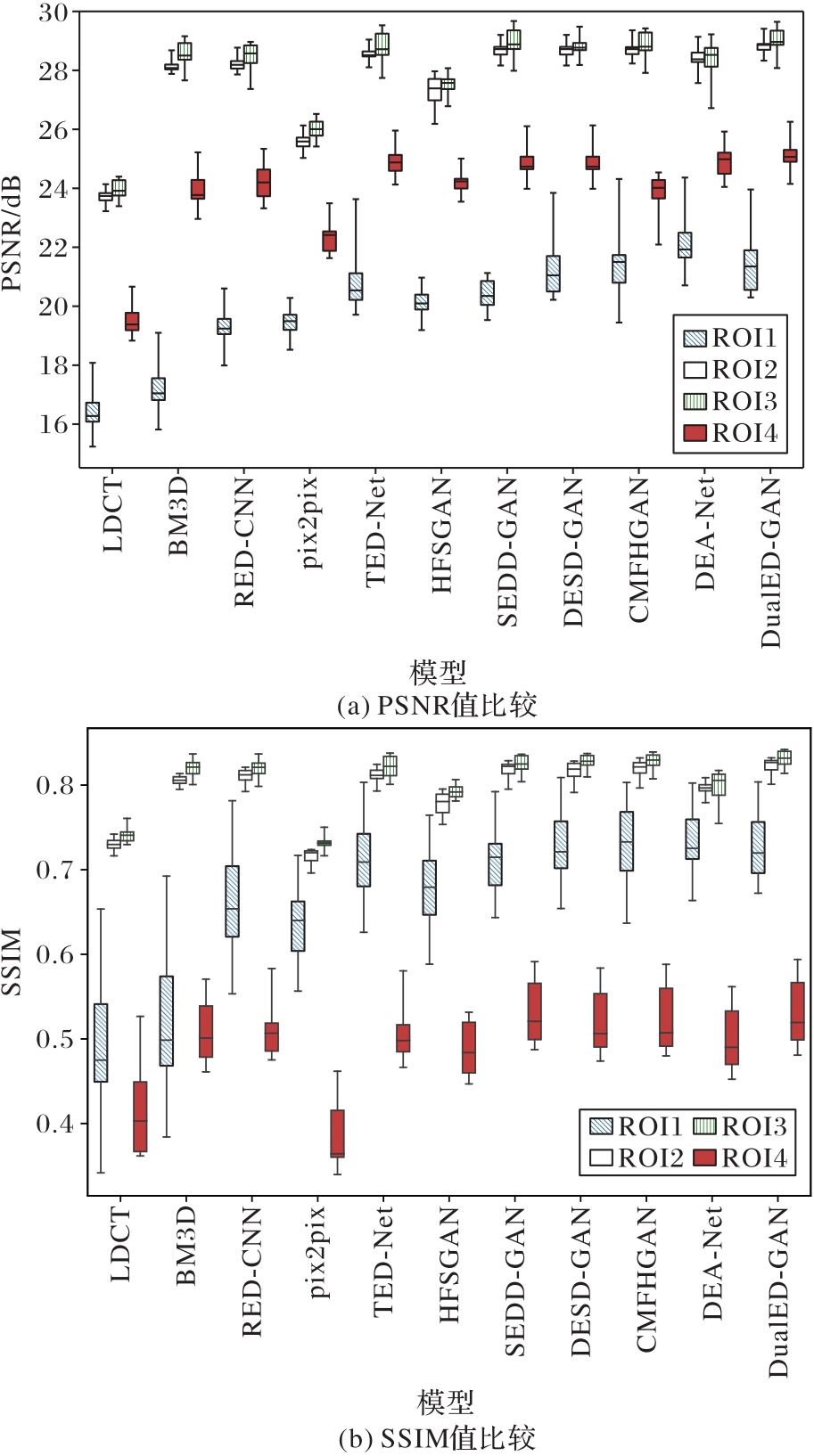 图9 不同模型降噪结果在图6~8所示ROI1、ROI2、ROI3、ROI4上的平均表现的箱线图
