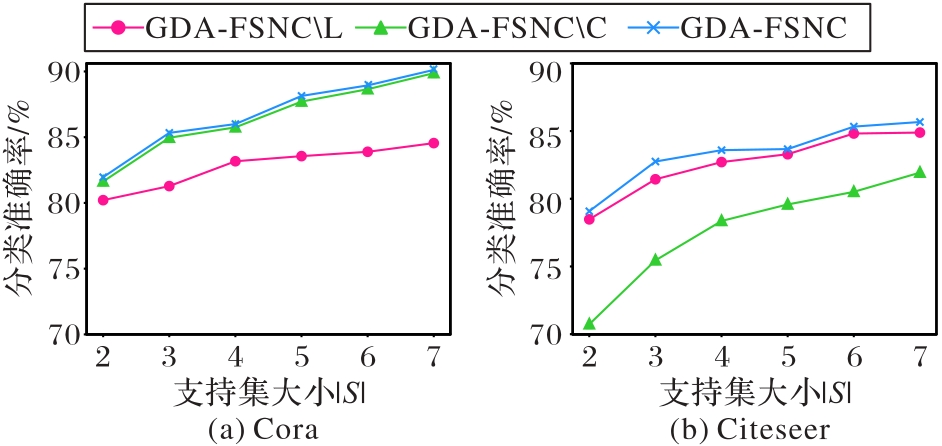 表6 GDA-FSNC及其变体模型的节点分类结果 (%)