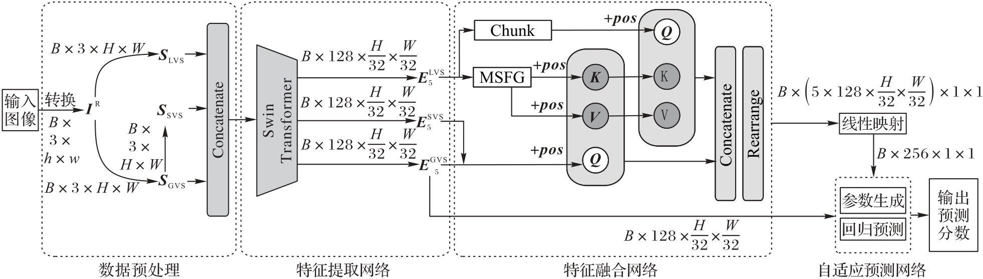 Image data in actual business scenarios usually presents the characteristics of rich content and complex distortion performance, which is a great challenge to the generalization of objective Image Quality Assessment (IQA) algorithms. In order to solve this problem, a No-Reference IQA (NR-IQA) algorithm was proposed, which is mainly composed of three sub-networks: Feature Extraction Network (FEN), Feature Fusion Network (FFN), and Adaptive Prediction Network (APN). Firstly, the global view, local patch, and saliency view of the sample were input into the FEN together, and the global distortion, local distortion, and saliency features were extracted by Swim Transformer. Then, the cascaded Transformer encoder was used to fuse the global distortion features and local distortion features, and the potential correlation patterns of the two were explored. Inspired by the human visual attention mechanism, the saliency features were used in the FFN to activate the attention module, so that the module was able to pay additional attention to the visual salient region, so as to improve the semantic parsing ability of the algorithm. Finally, the prediction score was calculated by the dynamically constructed MultiLayer Perceptron (MLP) regression network. Experimental results on main stream synthetic and real-world distortion datasets show that compared with the DSMix (Distortion-induced Sensitivity map-guided Mixed augmentation) algorithm, the proposed algorithm improves the Spearman Rank-order Correlation Coefficient (SRCC) by 4.3% on TID2013 dataset, and the Pearson Linear Correlation Coefficient (PLCC) by 1.4% on KonIQ dataset. The proposed algorithm also demonstrates excellent generalization ability and interpretability, which can deal with the complex distortion performance in business scenarios effectively, and can make adaptive prediction according to the individual characteristics of the sample.