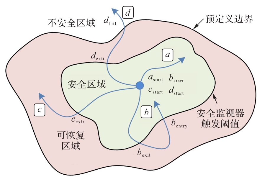 | 文献[ | 无人机外环制导功能安全保障问题 | 包含不同反馈级别的RTA交互,并针对外环制导反馈级提出更详细的RTA系统设计 | 高级控制指令输出 | 安全的控制指令输出 | 临时 | 恢复 | 复杂 |