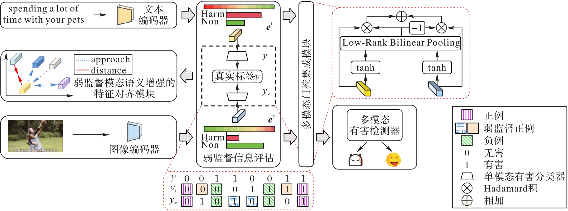 社交媒体上多模态有害信息的泛滥不仅损害公众利益,还严重扰乱社会秩序,亟需有效的检测方法。现有研究依赖预训练模型提取与融合多模态特征,忽视了通用语义在有害信息检测任务中的局限性,且未能充分考虑有害信息复杂多变的组合形式。为此,提出一种基于弱监督模态语义增强的多模态有害信息检测方法(weak-S),所提方法通过引入弱监督模态信息辅助多模态特征的有害语义对齐,并设计一种低秩双线性池化的多模态门控集成机制,以区分不同信息的贡献度。实验结果表明,所提方法在Harm-P和MultiOFF数据集上的F1值相较于SOTA (State-Of-The-Art)模型分别提高了2.2和3.2个百分点,验证了弱监督模态语义在多模态有害信息检测中的重要性。此外,所提方法在多模态夸张检测任务上取得了泛化性能的提升。