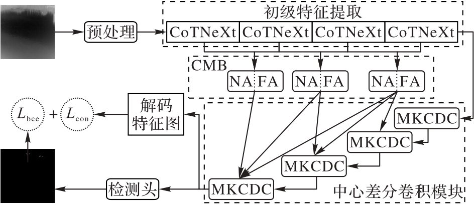 红外小目标检测(IRSTD)是目标检测领域中的研究热点和难点,具有像素小、对比度低和无纹理的特性,难以从小目标有限和扭曲的信息中学习正确的特征表示,因此IRSTD方法依然面临挑战。针对以上问题,提出多注意力对比学习的IRSTD方法。首先,采用U-Net为基本框架,在编码阶段提出一种融合频率注意力(FA)和空间注意力的上下文混合块(CMB),产生初级注意力特征图;其次,在解码阶段设计多核中心差分卷积(MKCDC),用于提取小目标在不同尺度下都稳定表征的核心信息;最后,联合二元交叉熵损失和对比损失函数训练小目标检测网络,提高小目标特征表示能力,得到富于判别的小目标检测模型。实验结果表明,在IRSTD-1k和NUAA-SIRST数据集上,所提方法的检测率(Pd)分别达到96.63%和100.00%,与密集嵌套的注意力网络(DNA-Net)相比,分别提高了4.71和1.90个百分点。可见,所提方法有效提高了IRSTD性能。