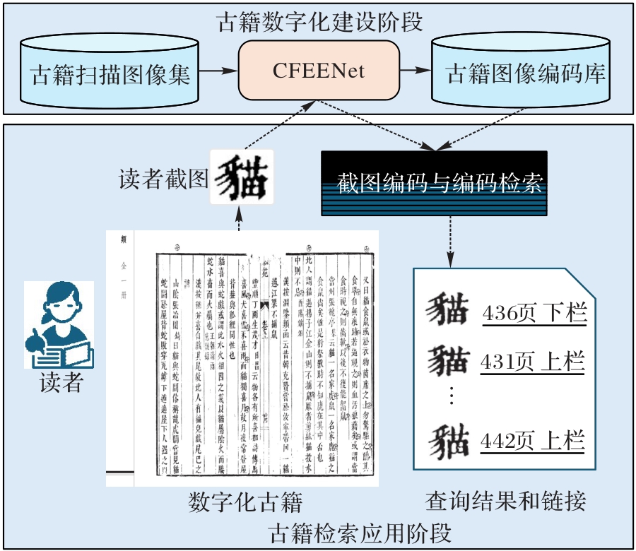 古籍汉字检索是当前古籍数字化工作的一部分。古籍中通常存在汉字印刷字模不一致和字体种类多的现象,使用视觉特征实现汉字检索是有效的解决方案。因此,提出汉字特征提取编码网络(CFEENet)。首先,使用卷积神经网络(CNN)提取古籍汉字图像的视觉特征;其次,使用可训练的通用向量聚合层NetVLAD聚合并编码视觉特征;最后,使用余弦相似度计算编码相似性以实现古籍汉字检索。此外,使用t-分布随机邻域嵌入(t-SNE)对CFEENet编码降维后进行可视化分析,发现CFEENet编码形成的簇密度高、簇间重叠小且编码分辨率高。在多个古籍数据集上测试CFEENet的实验结果表明,CFEENet在大多数场景下的平均精度均值(mAP)和F1分数优于古籍汉字图像特征提取网络(ACCINet)等对比方法,且在检索质量与效率之间实现了良好平衡,验证了CFEENet在古籍汉字检索任务中的适用性与有效性。
