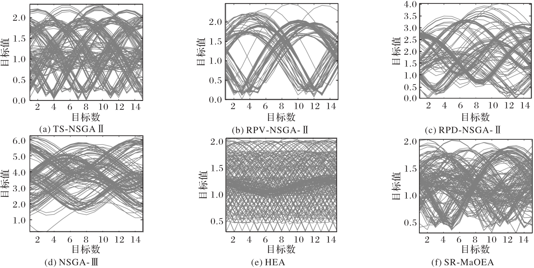 图6 SR-MaOEA和其他5个MaOEA在MAF8上获得的15个目标值的目标空间的平行坐标图