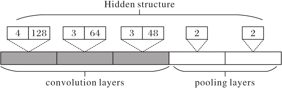 | Convolution layer | the filter size, the number of feature maps, the stride size, the convolutional type, the mean value of filter elements, and the coefficient of L2 |