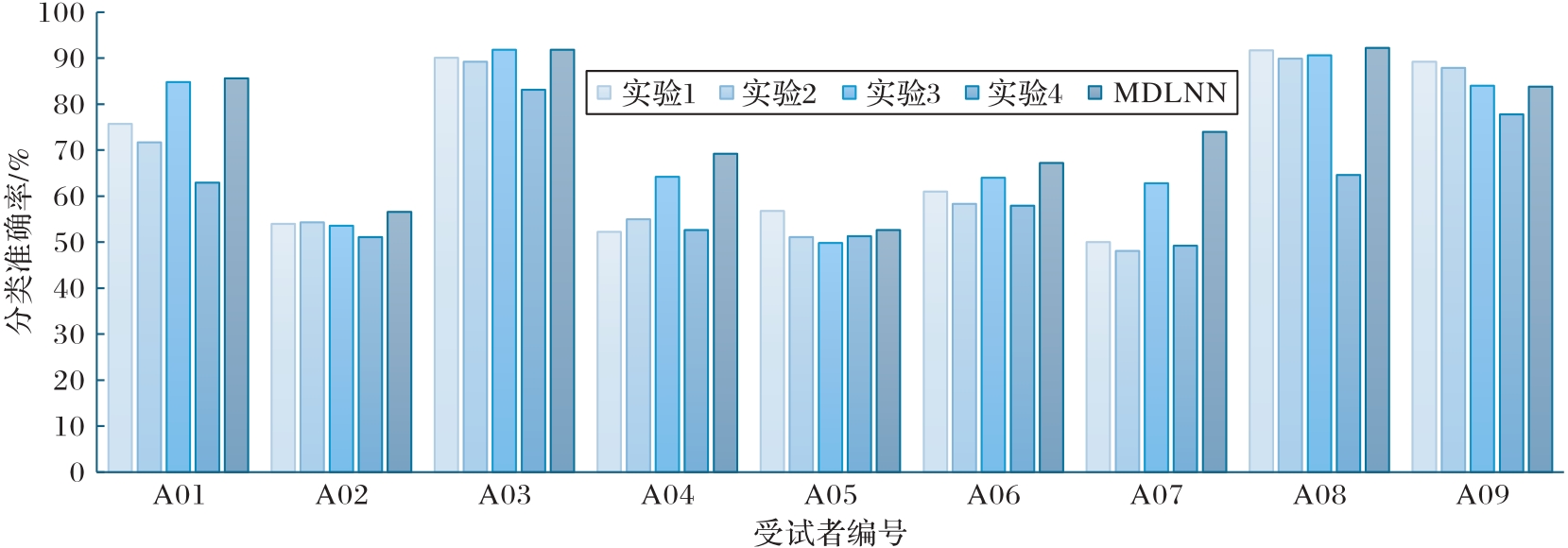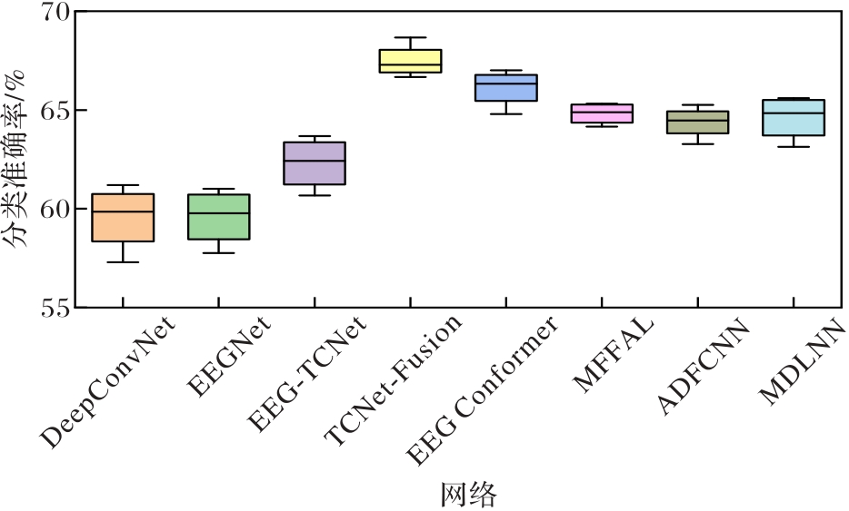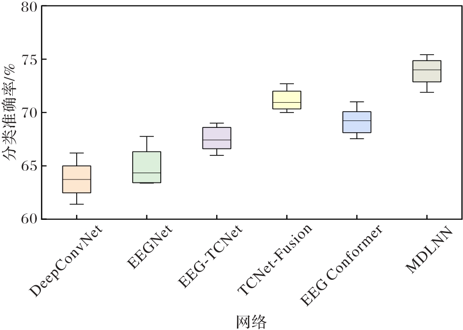 针对解码运动想象脑电信号(MI-EEG)时大规模网络解码速度慢,以及特征信息未能充分利用等问题,提出一个多域特征融合的轻量化MI-EEG解码神经网络。该网络通过轻量化模块提取多域特征,包括利用SincNet提取频域特征以及利用时间卷积网络(TCN)提取时域特征;在时频域特征提取之后引入挤压激励(SE)注意力对特征图进行自适应校准,以突出关注重要特征并抑制冗余信息。最后,利用可分离卷积实现时频特征的有效融合,解决单域特征信息不足的问题。此外,采用交叉熵和中心损失函数联合约束网络的训练过程,以优化类内和类间的分类性能。实验结果表明,该网络在BCI 2a、SMR-BCI和OpenBMI这3个运动想象(MI)公开数据集上的参数量分别为6 870、5 690和6 870,平均准确率分别达到74.78%、71.93%和65.40%,平均Kappa值分别达到0.70、0.66和0.59。与深层卷积网络(DeepConvNet)、轻量级脑电信号卷积神经网络(EEGNet)和基于时间卷积的脑电信号识别网络(EEG-TCNet)相比:在BCI 2a数据集上,所提网络的平均准确率分别提升了11.06、8.85和6.36个百分点;在SMR-BCI数据集上,所提网络的平均准确率分别提升了10.53、4.17和3.57个百分点;在OpenBMI数据集上,所提网络的平均准确率分别提升了5.09、4.99和2.33个百分点。可见,所提网络在保证轻量化的同时兼顾了解码性能。