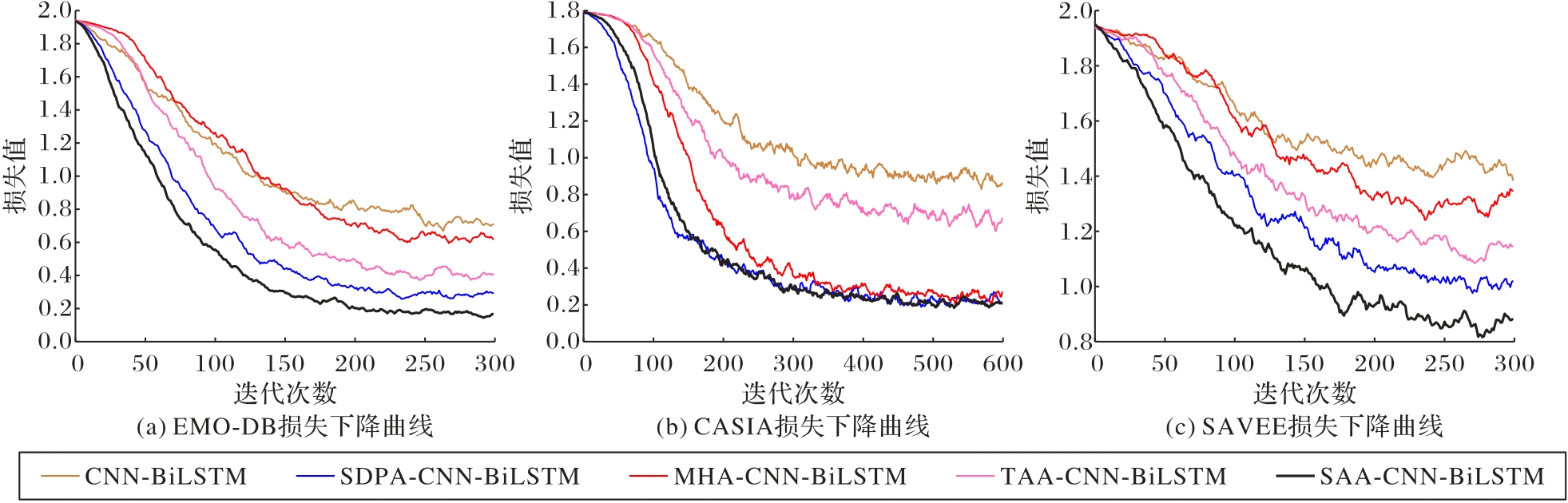 Aiming at the problems of incomplete representation of speech information by single speech emotion features and low utilization of speech features by the model, a multi-feature fusion speech emotion recognition method based on SAA-CNN-BiLSTM network was proposed. The method enhanced data by introducing noise,volume and audio rate boosters,enabling the model to learn diverse data features,and integrated multiple features such as fundamental frequency, time domain and frequency domain features to comprehensively represent emotional information from different perspectives. Besides, based on Bidirectional Long Short-Term Memory (BiLSTM) network, Convolutional Neural Network (CNN) was introduced to capture the spatial correlation of the input data and extract more representative features. At the same time, a Simplified Additive Attention (SAA) mechanism was constructed to simplify the explicit query keys and query vectors, so that the calculation of attention weights did not depend on specific query information. Features of different dimensions were able to be correlated and influenced each other based on the attention weights. In this way, the information between features was able to be interacted and fused with each other, thus improving the effective utilization of features. Experimental results show that this method achieves the weighted precision of 87.02%, 82.59%, and 73.13%, respectively, on the EMO-DB, CASIA, and SAVEE datasets. Compared with the baseline methods such as Incremental Convolution (IncConv), Novel Heterogeneous Parallel Convolution BiLSTM (NHPC-BiLSTM), and Dynamic Convolutional Recurrent Neural Network (DCRNN), the improvements are 0.52-9.80, 2.92-23.09, and 3.13-16.63 percentage points, respectively.