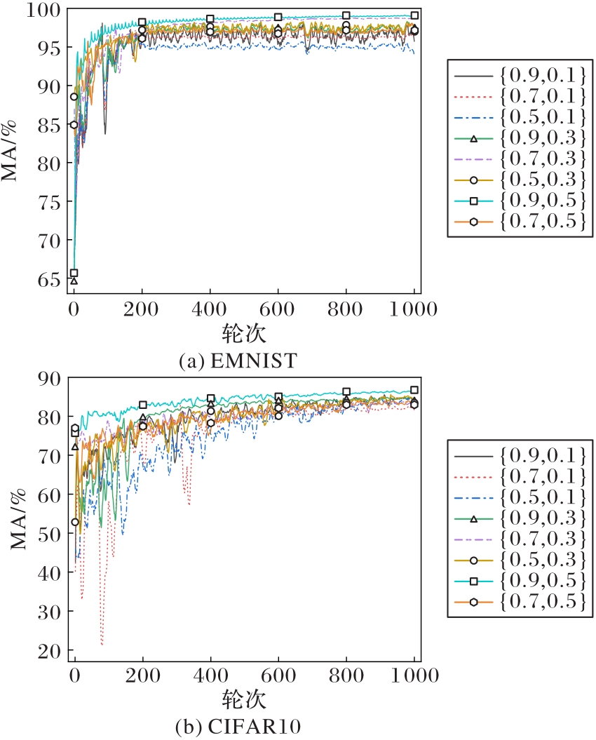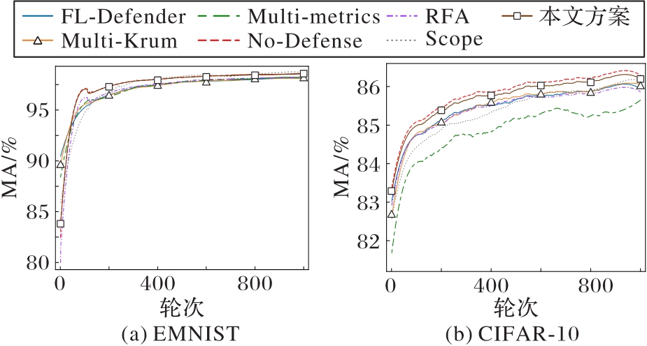 Tab. 2 Comparison of ASR of different defense schemes on EMNIST and CIFAR-10 datasets