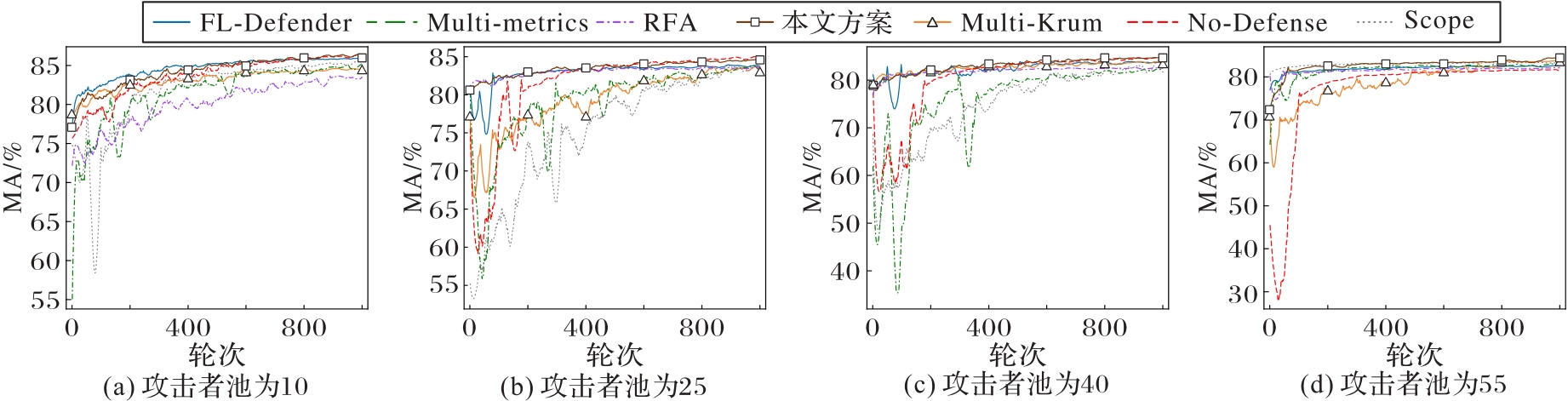 | 防御方案 | attacker pool为10 | attacker pool为25 | attacker pool为40 | attacker pool为55 | ||||