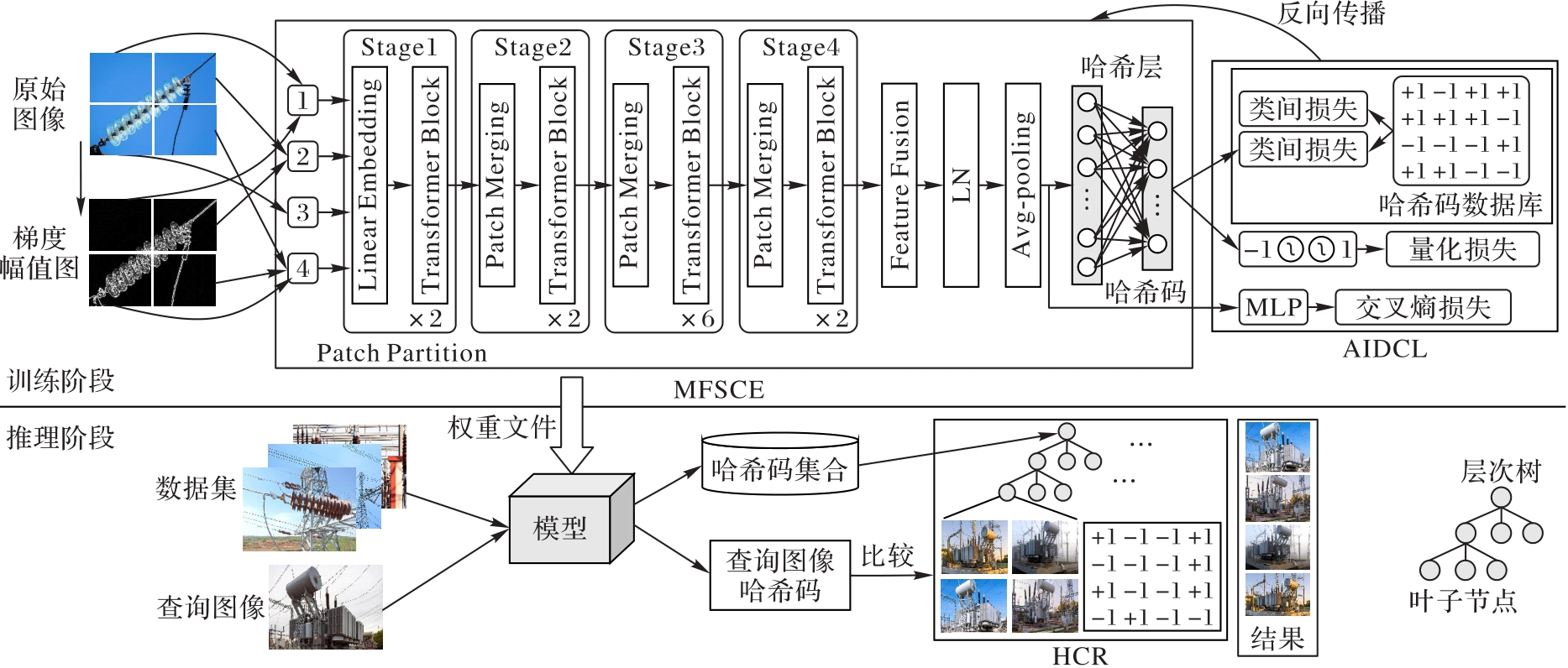 针对现有的图像检索方法难以有效辨别和提取电力设备的相似结构信息和纹理细节特征,导致检索精度和效率低的问题,提出基于改进Swin Transformer的电力图像检索方法(PIR-iSwinT)。首先,提出多特征结构交叉增强模块(MFSCE),通过结合梯度幅值图的交叉注意力机制增强模型对设备结构和边缘特征的感知能力;其次,设计自适应类间差异中心损失模块(AIDCL)加强模型对同类样本和异类样本的辨别能力;最后,构建层次聚类检索模块(HCR)优化检索过程中的样本匹配策略并降低计算复杂度,进一步提升检索精度和效率。在自建电力场景数据集和NUS-WIDE数据集上的实验结果表明,当哈希码长度为32 bit时,PIR-iSwinT的平均精度均值(mAP)分别达到96.76%和92.68%,与HRMPA(Hash image Retrieval based on Mixed attention and Polarization Asymmetric loss)相比分别提升了2.35%和0.56%。可见,PIR-iSwinT能有效提取和辨别电力设备的细节结构特征,提升检索效率,同时展现出良好的泛化能力,验证了所提方法的有效性。